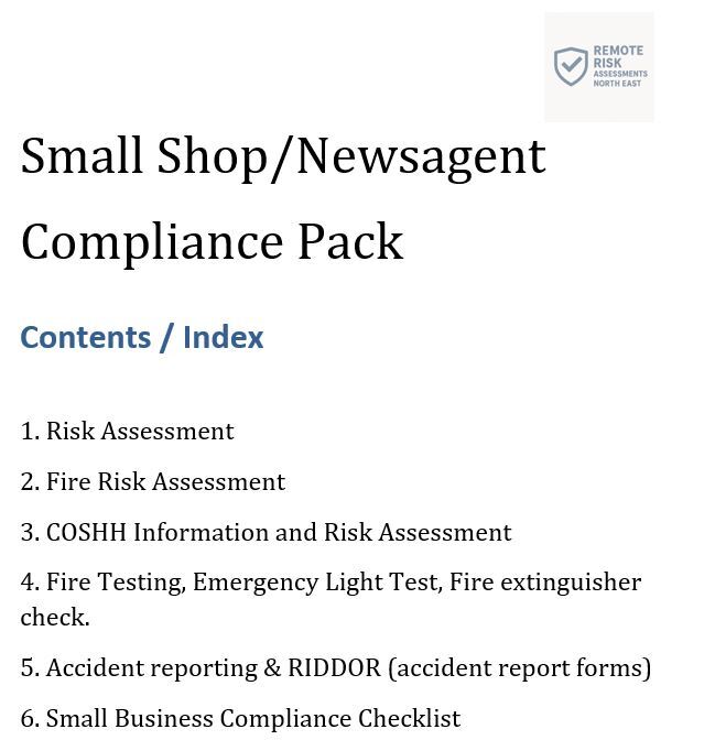 ποΈ Small Retail & Newsagent Health & Safety Compliance Pack β Fire, COSHH, Risk Assessments (UK) π§Ύ Full Product Description: Own or manage a small retail business in the UK? Whether it's a newsagent, convenience store, vape shop, off-licence or gift shop β this compliance pack is built for you. Covering all the core health and safety requirements for UK retail, this ready-to-use bundle helps you stay compliant without the stress of creating paperwork from scratch. β Whatβs Included: Fire Risk Assessment (legal requirement for public premises) COSHH Template (for cleaning supplies, stock chemicals, aerosols etc.) General Risk Assessment (slips, stacking, lone working, customer safety) Accident Report Log Staff Safety Checklist Fire Safety Log Editable Templates (.docx β use in Word or Google Docs) π Perfect For: Newsagents Vape shops Mini-marts & off-licences Card/gift shops Independent retail units Corner shops & kiosks Written by UK-based compliance professionals and 80% pre-filled, this pack gives you the tools you need to stay legally compliant, avoid fines, and keep staff and customers safe. π₯ Instant digital download Quick to edit and print β no jargon, just practical help. π The simple way to protect your retail business. π¦ Summary Box: β Fire Risk Assessment (pre-filled) β COSHH Template (cleaning + stock chemicals) β General Risk Assessment β Accident Log β Staff Safety Checklist β Fire Log Sheet β Fully editable Word documents (.docx) Made for small UK retailers who want compliance sorted β fast.