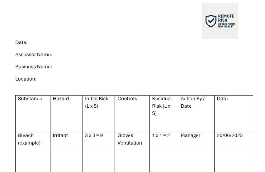 - COSHH Template (for cleaning supplies, stock chemicals, aerosols etc.)